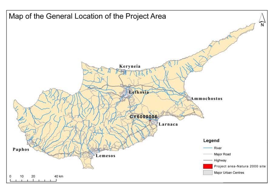 The project's targeted site is located 3 km southwest of Aradippou and 7 km northeast of Larnaca and its boundaries follow more or less the delimitation line of Rizoelia National Forest Park. The latter covers an area of 97 ha.